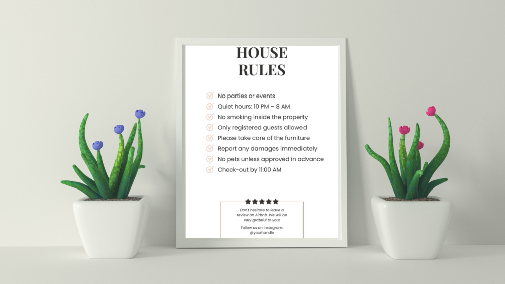 Free editable Canva template for creating a clean and simple House Rules sign. Perfect for Airbnb and short-term rental hosts.